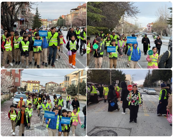 araya gelen öğrenciler, grup halinde ve düzenli bir şekilde okula yürüyüş gerçekleştirecek.