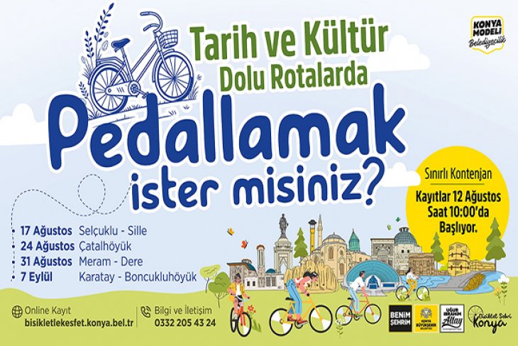 Rehber eşliğinde düzenlenecek bisiklet turları için sınırlı sayıda katılım alınacak. Bilgi ve kayıt adresi; “bisikletlekesfet.konya.bel.tr”.